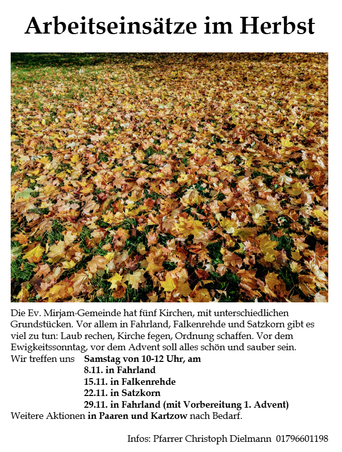 19.10. 9.30 Uhr, Kartzow mit Pfarrerin Almut Gaedt aus Töplitz – sie bringt ihren Gemeindekirchenrat mit, sie beschäftigen sich mit Umnutzung / Mehrfachnutzung von Kirchengebäuden und besichtigen dazu unsere Kirchen in Falkenrehde und Paaren.